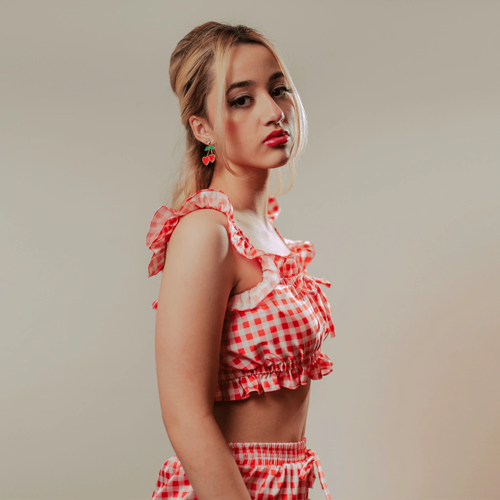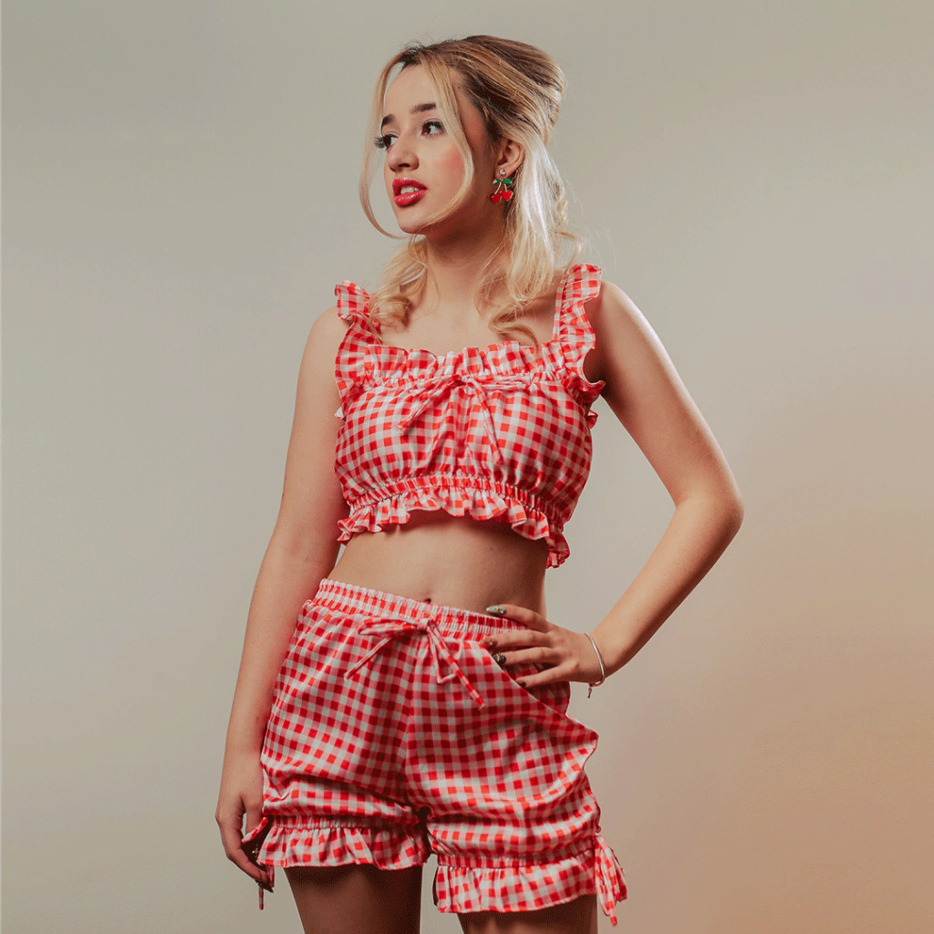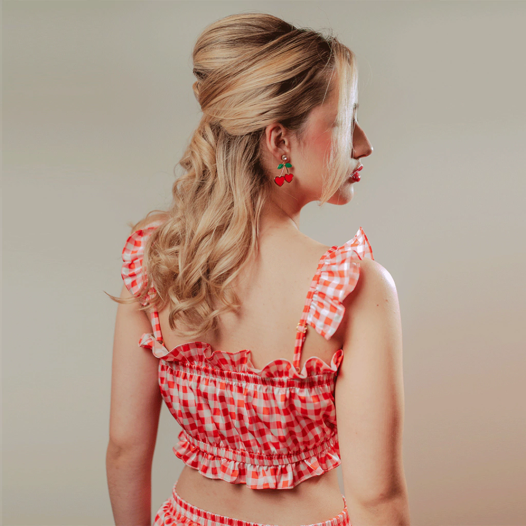 Com estampa xadrez vermelho e branco, tendência absoluta da temporada,
