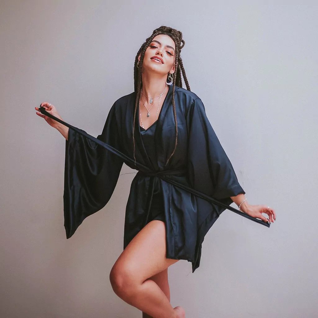 usando. Possui cinto para amarrar do mesmo tecido do robe,