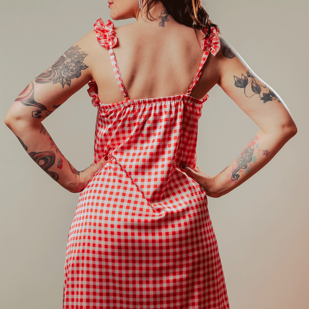 e conforto. Com estampa xadrez picnic em vermelho e branco,